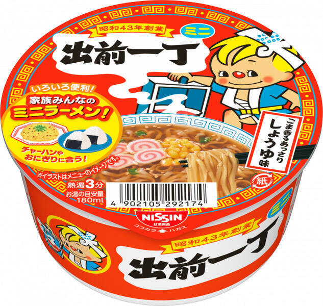 1968年の「出前一丁」を、より手軽に楽しめるミニサイズのカップ麺として提案する商品です。