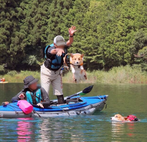 カヤックの上に立ったりのきやさんが、湖面に向かってコーギーの「麗」ちゃんを放り投げています。