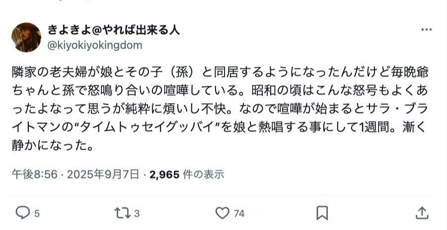 「隣家の老夫婦が娘とその子(孫)と同居するようになったんだけど毎晩爺ちゃんと孫で怒鳴り合いの喧嘩している。昭和の頃はこんな怒号もよくあったよなって思うが純粋に煩いし不快。なので喧嘩が始まるとサラ・ブライトマンの“タイム・トゥ・セイ・グッバイ”を娘と熱唱する事にして1週間。漸く静かになった」