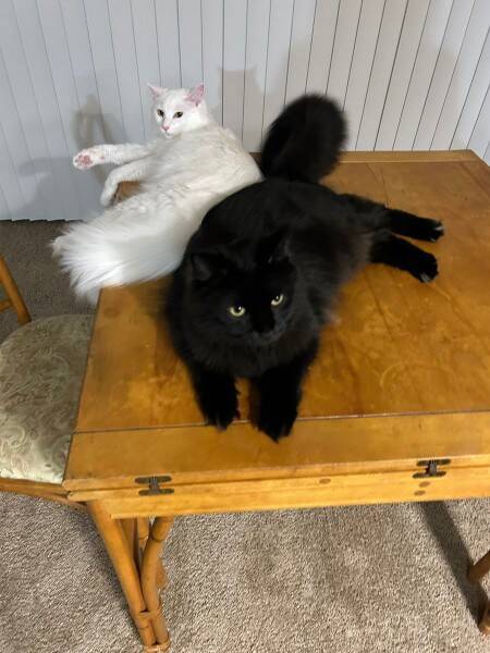 どうやら飼い主さんが普段食事に使うテーブルに、仲良く並んで堂々と横たわっていたようです。この抜け目のない行動……さすがは猫。