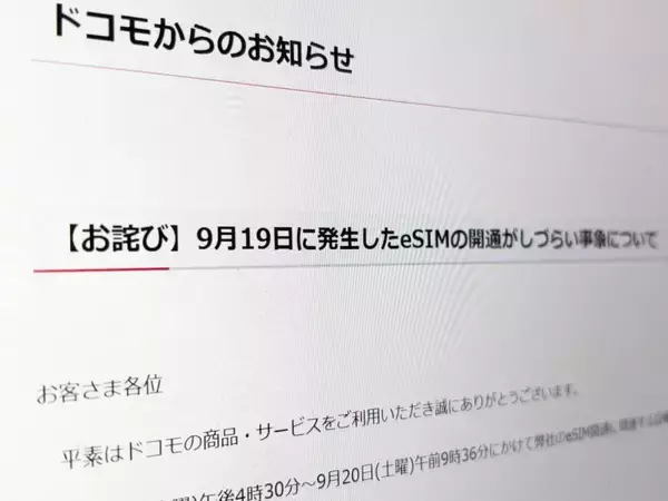 NTTドコモは、9月19日から20日にかけて発生した「eSIMの開通がしづらい事象」に関して公式に謝罪を発表しました。