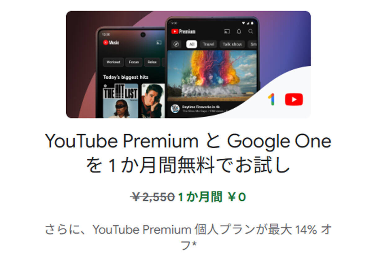 「YouTube Premium」と「Google One」をセットで利用できるこのプランでは、初月無料のあと、Google Oneプレミアム特典が月額1450円、YouTube Premium個人プランが月額1100円で提供されます。YouTube Premiumは通常1280円のところ、セット契約では14%の割引が適用される形です。