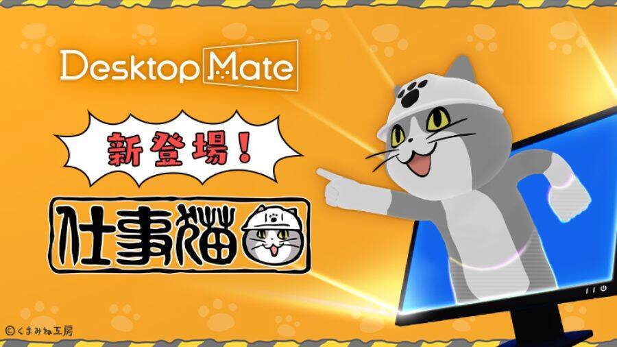 「Desktop Mate」は、PCのデスクトップ上に3Dキャラクターを表示させ、ウィンドウの上を歩かせたり、マウスカーソルと遊ばせたりできるソフト。今回追加される「仕事猫」は、イラストレーターくまみね氏による人気キャラクターで、工事用ヘルメットを被って指差呼称をする姿がおなじみです。