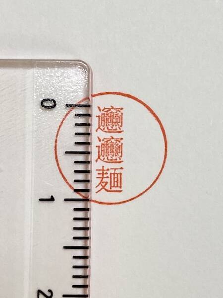 このほど永江印祥堂の公式Xが公開した「麺ハンコ」は丸枠の中に、縦に「麺」と彫り込まれたシンプルなデザイン。ハンコの直径は1円玉よりも小さく、1文字のサイズは約3ミリしかありません。