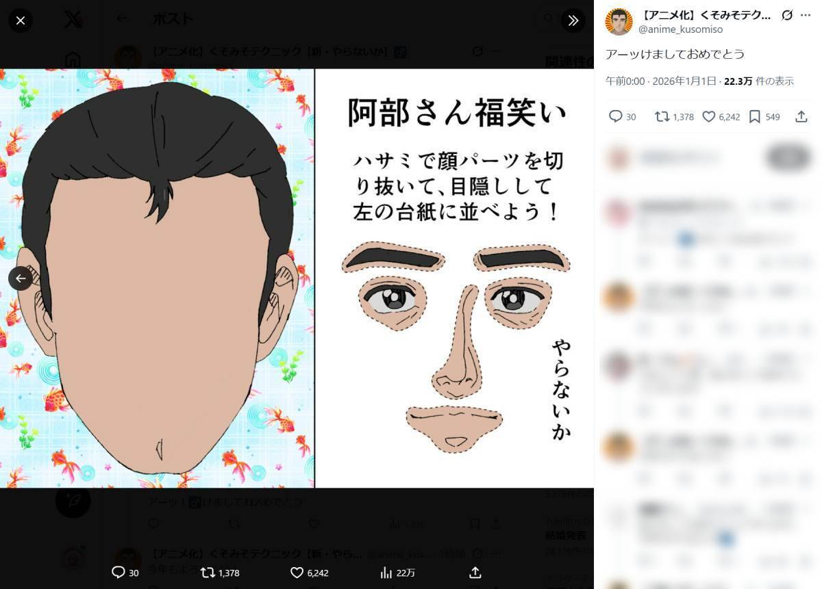 「福笑い、やらないか」と言わんばかりのこのサプライズ提供に、ネットユーザーたちも騒然。返信欄では、「急に流れてきたから初笑いこれだよ」「ウホッ……いい福笑い」といった、困惑と歓喜が入り混じった声が相次いでいます。