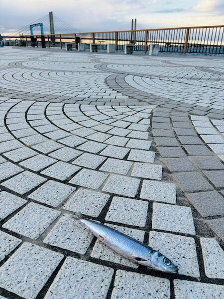 遠くに見える広い空と、銚子大橋、人気のない遊歩道、そしてイワシ。いっそ芸術的ですらあるようなシュールな組み合わせです。