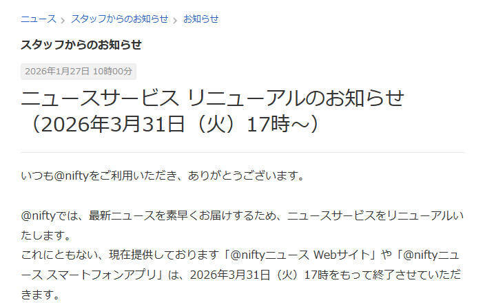 これに伴い、現在提供している「@niftyニュース」のWebサイトおよびスマートフォンアプリは、2026年3月31日17時をもって終了します。