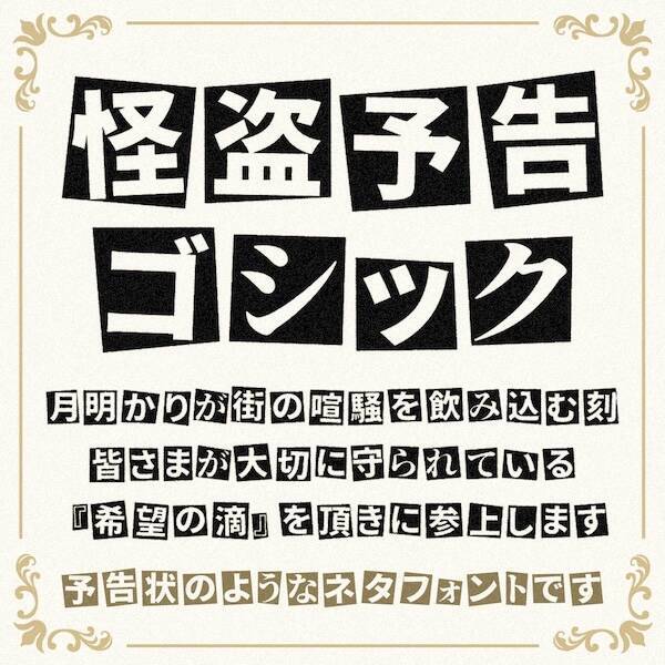 ネット上で数々の独自フォントを公開しているlavsicさんがこのほど発表したのが、予告状のような文章が作れる「怪盗予告ゴシック」です。フリーフォントのため無料で利用でき、誰でもお手軽に自分のPCにインストールして楽しむことができます。