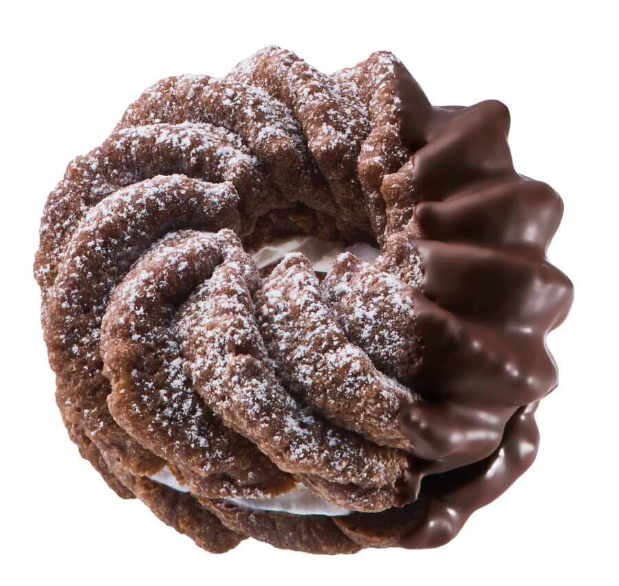 「エンゼルショコラ」(テイクアウト194円/イートイン198円)は、ショコラフレンチ生地にホイップクリームをサンドし、チョコレートでコーティング。間違いない王道の組み合わせです。