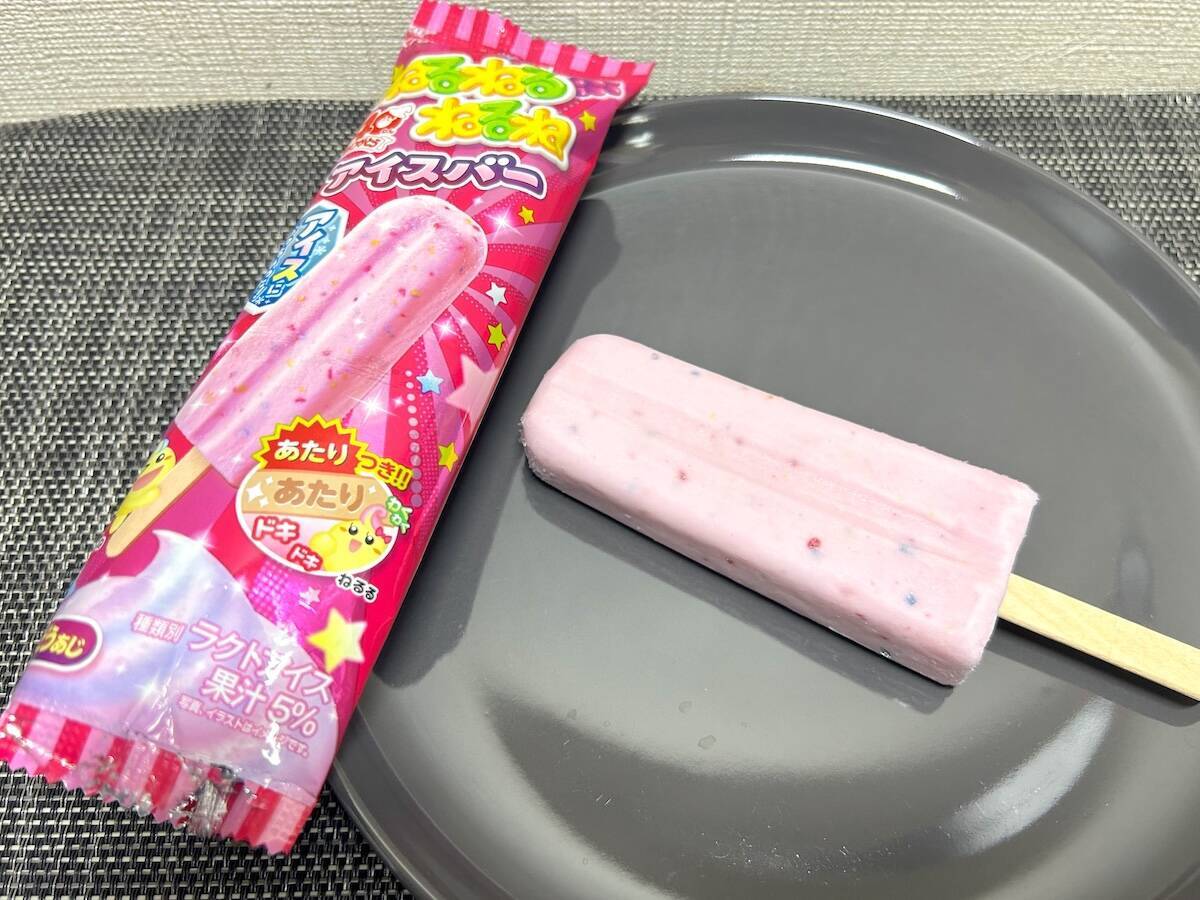パッケージは「ねるねるねるね」らしいポップで鮮やかなデザイン。封を開けると少し細身のアイスが姿を現します。ちなみに“あたり”つきです。