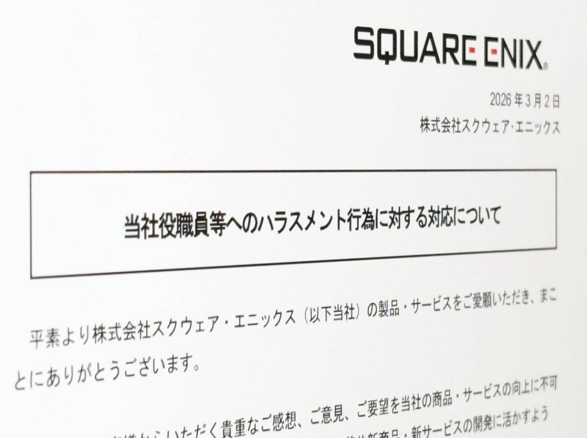 株式会社スクウェア・エニックスは3月2日、公式サイトにて「当社役職員等へのハラスメント行為に対する対応について」と題した声明を発表。
