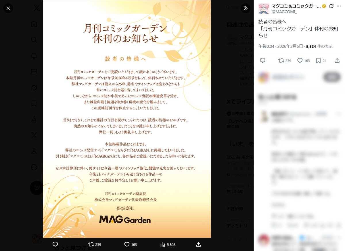株式会社マッグガーデンが発行する漫画雑誌「月刊コミックガーデン」が、今号となる2026年4月号をもって休刊することが、公式Xおよび公式サイトにて発表されました。