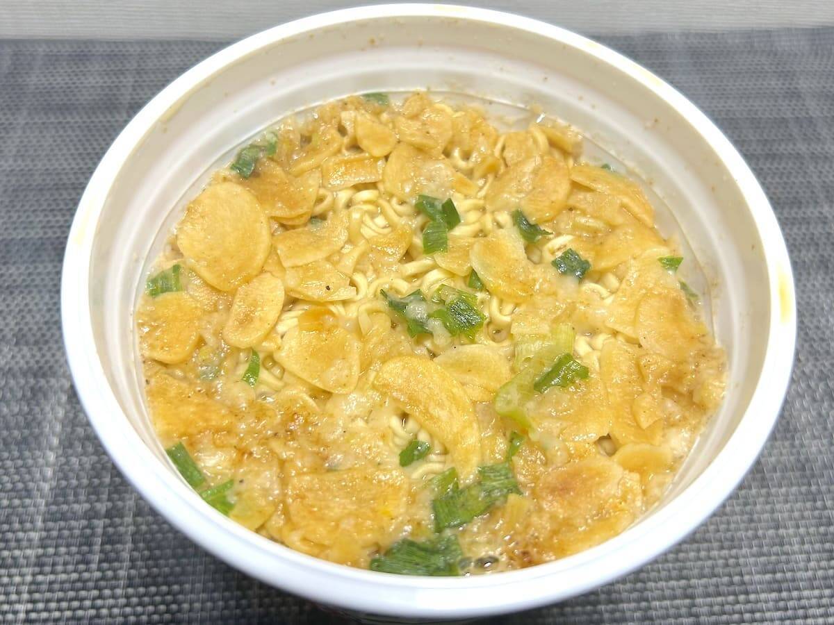 実際に蓋を開けると、ビジュアルは想像していた以上。フライドガーリックが麺を覆っています。そしてこの時点でかなり香りが立っていて、危うく「あ~、おいしい」と言いかけてしまいました。