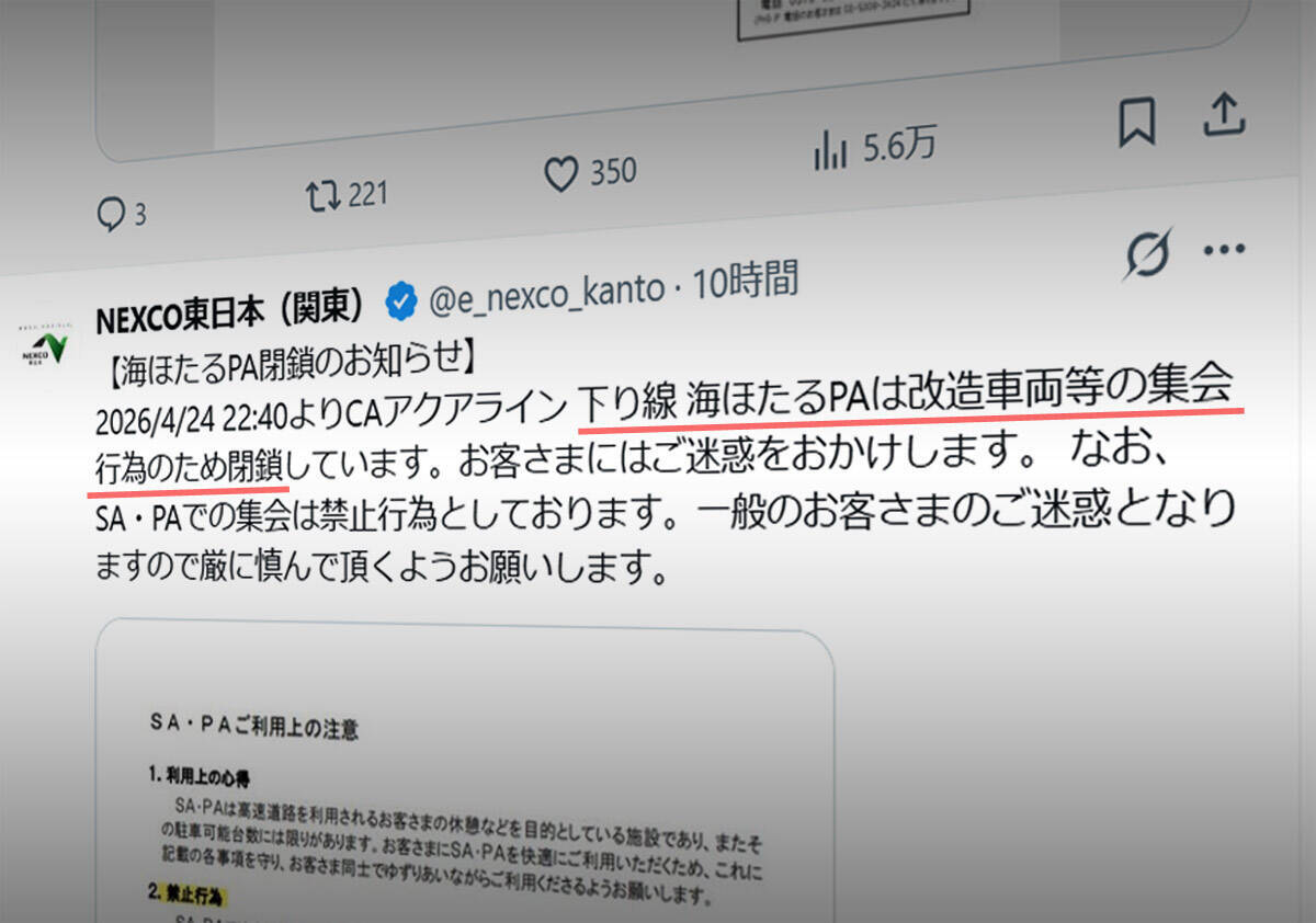 サービスエリア・パーキングエリア内での「集会行為」は禁止されており、一般利用者への影響を避けるための措置とみられます。投稿では「ご迷惑をおかけします」としつつ、理解と協力を呼びかけていました。