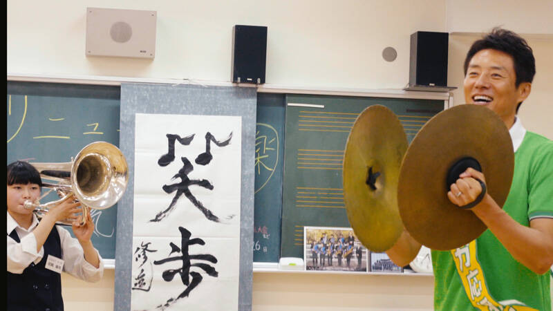 さらにその場で「笑」の竹冠を音符の記号にして書いたオリジナルの“修造漢字”「笑歩」(読み方:しょうほ)を部員たちに送ります。「リニューアルするためには“笑”って“歩”んでいる。そんな音を奏でて欲しい」と、「笑歩」に込めた思いを語ったのでした。