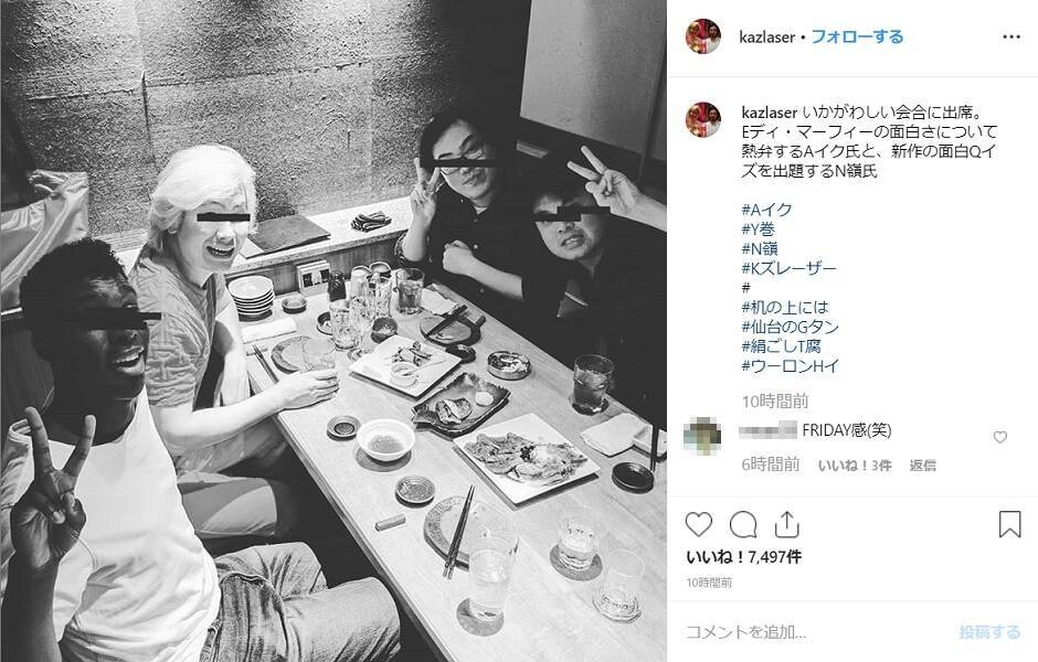 カズレーザーさんは7月11日、自身のInstagramに「いかがわしい会合に出席」と、出席者全員の目線が隠れたモノクロ写真を公開。その光景は、まるで週刊誌にスクープされたかのような雰囲気を醸し出しています。