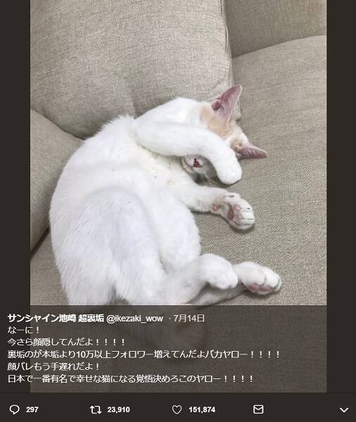 日本で一番有名で幸せな猫になる覚悟決めろこのヤロー!!!! pic.twitter.com/EOPYX70WZO— サンシャイン池崎 超裏垢 (@ikezaki_wow) July 14, 2019