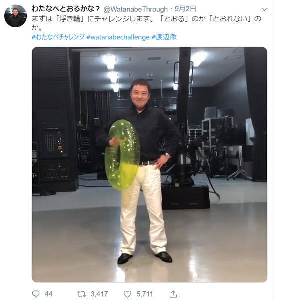 まずは「浮き輪」にチャレンジします。「とおる」のか「とおれない」のか。 #わたなべチャレンジ #watanabechallenge #渡辺徹 pic.twitter.com/FmwMz8tgS1