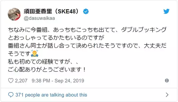 はい、でも、番組さん同士のやりとりで決まったことなので、須田も戸惑いましたが、ご心配なくです!と、結構言われてしまっているので強調しておきますね— 須田亜香里(SKE48) (@dasuwaikaa) September 24, 2019