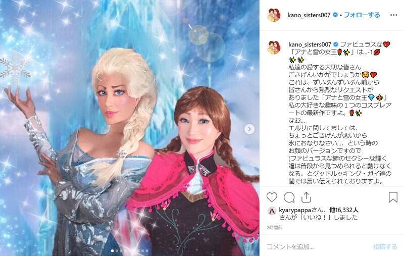 ディズニー映画の名作「アナと雪の女王」に登場する、アナとエルサのコスプレを叶姉妹がInstagramで披露。そのクオリティーの高さに、「芸術的」という声が多数よせられています。
