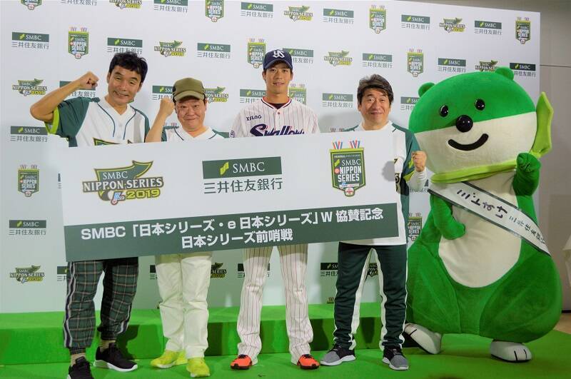 コナミの「パワプロ」を使用した日本シリーズ前哨戦「『日本シリーズ・e日本シリーズ』W協賛記念 日本シリーズ前哨戦 記者発表会」は、三井住友銀行が6年連続で日本シリーズ、2年連続でe日本シリーズをW協賛することを記念して、なんと三井住友銀行の汐留出張所で開催。さらに、山田選手やダチョウ倶楽部、コナミの「パワプロ」を使って争われるeBASEBALLのプロプレイヤーが登場し、明後日の本番を期待させる盛り上がりを見せました。