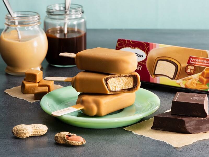 ミルクのコクを感じるキャラメルアイスクリームを、食感と味わいの異なる2層のコーティングで包 み込み、一口かじると、2層のコーティングの間から、香ばしいピーナッツソースがとろりとあふれ出し、甘く濃厚な味わいがやみつきになる美味しさとなっています。