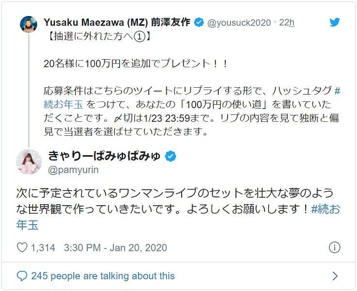 そして、1月19日に前澤お年玉当選確認サイトがオープン。約410万分の1000の確率に、応募者が一喜一憂する中、落選した人に朗報が……!なんと、20名に100万円を追加でプレゼントされることが発表。応募条件は、対象ツイートにリプライする形で、ハッシュタグ「#続お年玉」をつけて、自身の「100万円の使い道」を書くこと。