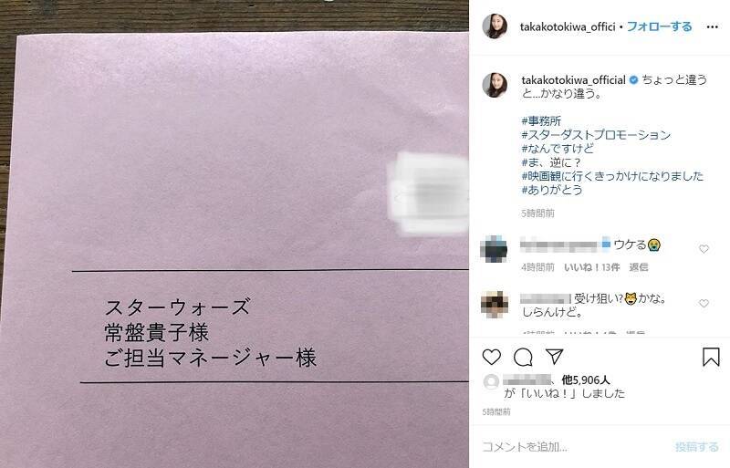 常盤さんは2月10日、自身のInstagramに「ちょっと違うと……かなり違う」というコメントと共に1枚の写真を投稿。そこには、おそらくDMだと思うのですが、宛名のところに「常盤貴子様」「ご担当マネージャー様」とあり、その上になんと「スターウォーズ」という文字が!