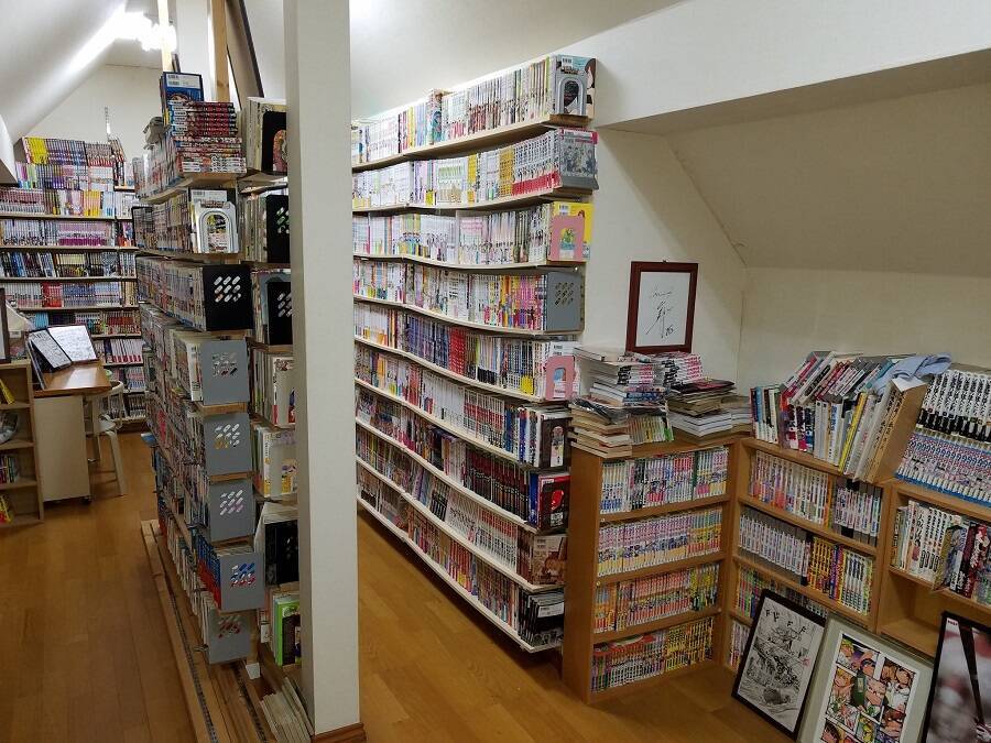 単行本のサイズに合わせた自作の棚には、作品ごとにきれいに背表紙が並んでいます。作品のファンならこの背表紙だけでも、どの漫画が置いてあるか分かるくらい。まるで本屋か図書館の様。そして、実は漫画の棚があるスペースはこの部分だけではないのだそう。