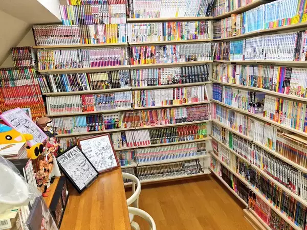 単行本のサイズに合わせた自作の棚には、作品ごとにきれいに背表紙が並んでいます。作品のファンならこの背表紙だけでも、どの漫画が置いてあるか分かるくらい。まるで本屋か図書館の様。そして、実は漫画の棚があるスペースはこの部分だけではないのだそう。