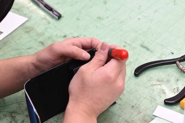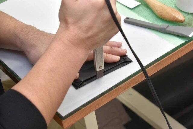 ネン引きをしてヘリ先から数ミリの部分に熱いコテで線を引くことでヘリの接着性を高めて耐久性と革の屈曲性を上げ、レザーアイテムの表情を引き締めます。