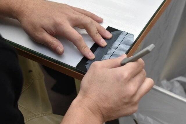 美しい線を入れるためには、熟練の技と手間が必要です。力の加減、道具の角度を調整しながら、最も美しく見える位置に、ちょうどよい太さと深さの線を入れていきます。クラフトマンシップに溢れた技法です。