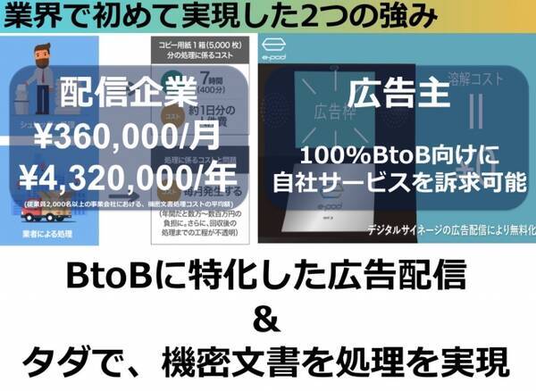 e-Pod Digitalとは、2つのビジネスモデル「機密文書処理サービス」と「広告メディア」を融合させた「三方よし」の考え方を体現している唯一無二のビジネスです。