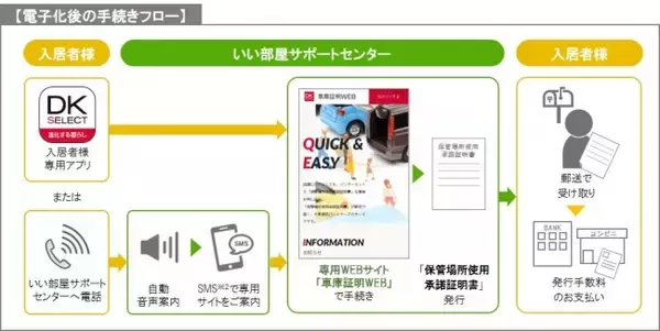 これまで、本証明書を発行するには、入居者様にご来店いただくか、電話でのお申込みが必要で、手続きできるのは営業時間内に限られていました。その内、約7割が最寄りの営業所へのご来店による申し込みとなっていましたが、今回これらの手続きが電子化されることにより、専用WEBサイトから24時間申し込みができるようになりました。お申込み後は、いい部屋サポートセンター※1にて本証明書が発行され、ご指定の郵送先へ送付されます。