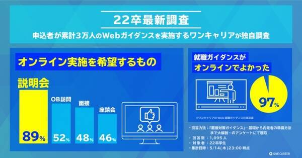 Web就職ガイダンスについて97%の22卒就活生が満足と回答しました。また、今後の就職活動でオンライン実施で良いと思うものについては、企業説明会が89%とトップで、続いてOB訪問(52%)、面接(48%)となりました。(*1)