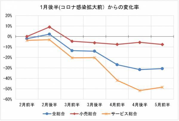 新型コロナウイルスの影響でほぼ全ての業種・業態で消費が減少していたが、ミクロ・マクロともに4月後半が底で、5月前半は減少幅を縮めている。「全総合」「サービス総合」は約3か月ぶりに下げ幅を縮小。「外食」「旅行」「交通」「娯楽」の下げ幅を縮小した。