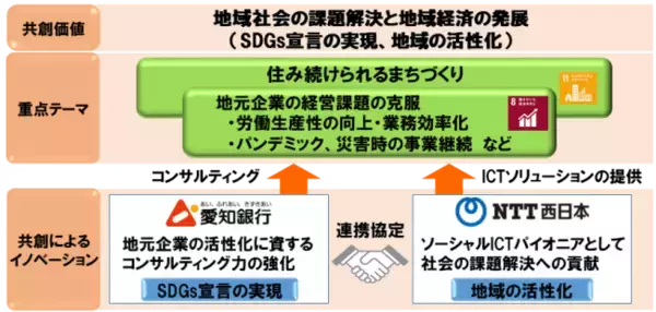 金融仲介機能とコンサルティング活動により地域経済の発展に取り組む愛知銀行と、ICTを活用して地域社会の活性化に取り組むNTT西日本が、双方が持つ経営資源やノウハウ等の強みを連携させることで、共創価値を生み、地域社会への貢献が期待できると判断したことから、連携協定を締結いたしました。