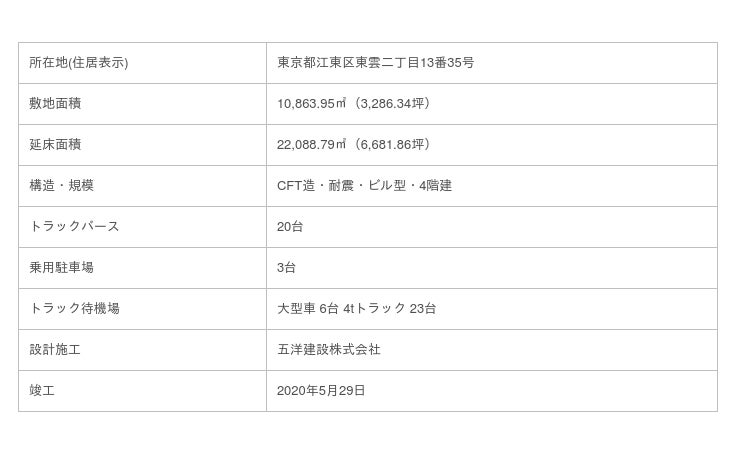 本物件は、安田倉庫株式会社(本社:東京都港区海岸/代表取締役社長:藤井 信行)との共同事業であり、当社の物流施設開発ノウハウと安田倉庫の倉庫運営ノウハウを融合しつつ、これまで事業を推進してまいりました。