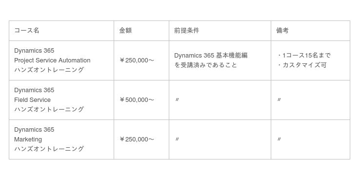 いずれもDynamics 365基本機能編コース(上記 当社トレーニング紹介ページ参照)を受講済みであることが前提条件となります。