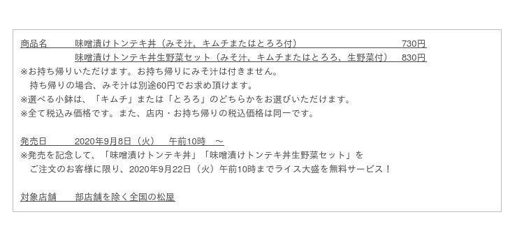 新発売を記念して、「味噌漬けトンテキ丼」「味噌漬けトンテキ丼生野菜セット」をご注文のお客様に限り、2020年9月22日(火)午前10時までライス大盛を無料サービスします。