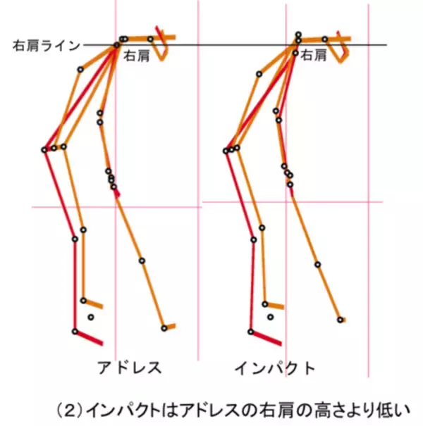 3. インパクトの右肩の高さがアドレスより高ければ引っ掛け傾向が強い