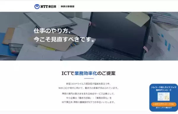 NTT東日本は、特設サイト『仕事のやり方、今こそ見直すべきです。』(https://www.ntteast-kanagawa.com/efficiency)を2021年3月1日(月)に公開いたしました。「テレワーク環境の整備」「業務のデジタル化・オンライン化」「バックオフィス業務の効率化」などに課題をもつ中小企業のお客さま向けにソリューションをご紹介し、ご相談・お問い合わせを受付けています。サイトを訪れたお客さま限定で、今なら「テレワーク導入ガイドブック」を無料でダウンロードいただけます※1。