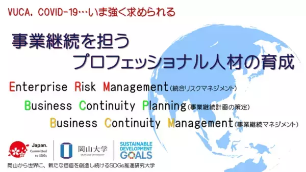 岡山大学では、単にコロナ禍を乗り切るだけではなく、次の時代のイノベーション創出を担う人材育成の一環として、ERMとBCP/BCMがわかる人材「事業継続プロフェッショナル(ABCP)」の育成を加速しています。また岡山大学だけではなく、他大学等へのノウハウ展開も実施していますので、ご興味、ご関心などある教育機関や企業・団体などの方は、お気軽にお問い合わせください。