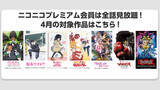 ニコニコ動画では、3月25日(木)12:00から「ガールズ&パンツァー」、4月1日(木)12:00から「坂本ですが?」「私がモテないのはどう考えてもお前らが悪い!」「世話やきキツネの仙狐さん」「アウト...