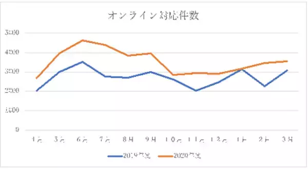 このオンライン対応がコロナ禍での外出自粛の影響から昨年度(2019年4月~2020年3月)に比べ、今年度(2020年4月~2021年3月※2021年3月度は予測値)は対応件数1.3倍の約43,000件の見込みとなりました。