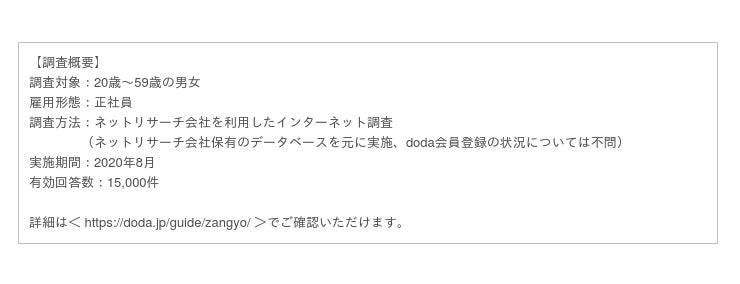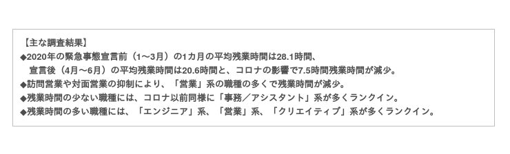 2020年4~6月の15,000人の1カ月あたりの平均残業時間は20.6時間でした。緊急事態宣言前の同年1~3月の平均(28.1時間)と比べると7.5時間短い結果となりました。