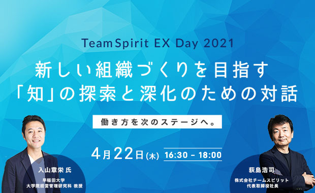 働き方改革プラットフォーム「TeamSpirit」を開発・提供する株式会社チームスピリット(代表取締役社長:荻島 浩司、 以下 チームスピリット)は、早稲田大学 大学院経営管理研究科 教授の入山章栄 氏をゲストスピーカーに迎え、イノベーションを創造させる組織と個人の新しい在り方を考えるオンラインイベント「TeamSpirit EX Day 2021 新しい組織づくりを目指す「知」の探索と深化のための対話 ー働き方を次のステージへー 」を2021年4月22日(木)に開催することをお知らせします。