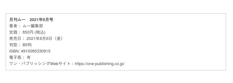 2色刷り特集 妖怪探偵団 フィッサマグナに信州妖怪伝説を辿る!!/実用スペシャル 「開運」と「招財」のまじない入門/特別付録 ネオ・パラダイムASKA アメリカUFOと闇の地底人/夜道を歩く無気味な白いヒューマノイドが出現!!/沖縄の小浜島に輝くUFOが出現!!/精霊モモちゃんの超常現象/インカ帝国を築いたのは日本人だった!!/杉沢村の謎/ほか ●好評連載 吉田悠軌のオカルト探偵/南山宏のちょっと不思議な話/松原照子の大世見/リュウ博士の見えない世界の歩き方/辛酸なめ子の魂活巡業/エミール・ジェラザードの西洋占星術/ネオ・パラダイムASKAグラム……ほか