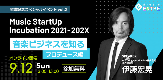 Studio ENTREは2030年に「日本発のアーティストがグローバル市場でコンスタントにヒットを生み出す環境をつくる」ことを目標に、エコシステム構築までのロードマップを発表。そのと取り組みの一環として、この度「Music StartUp Incubation」を開催します。