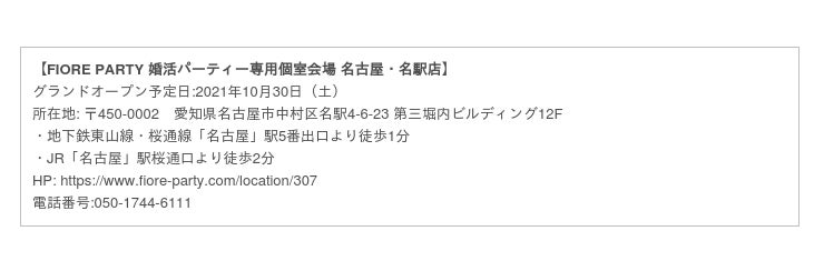 TMSグループが運営する婚活パーティーサービスであるフィオーレパーティー(https://www.fiore-party.com/)が、2021年10月30日(土)に、『フィオーレパーティー名古屋・名駅個室会場』をオープンいたします。東海エリアにお住まいの皆様へ、これまで以上に“真剣な出会い”の場をご提供いたします。